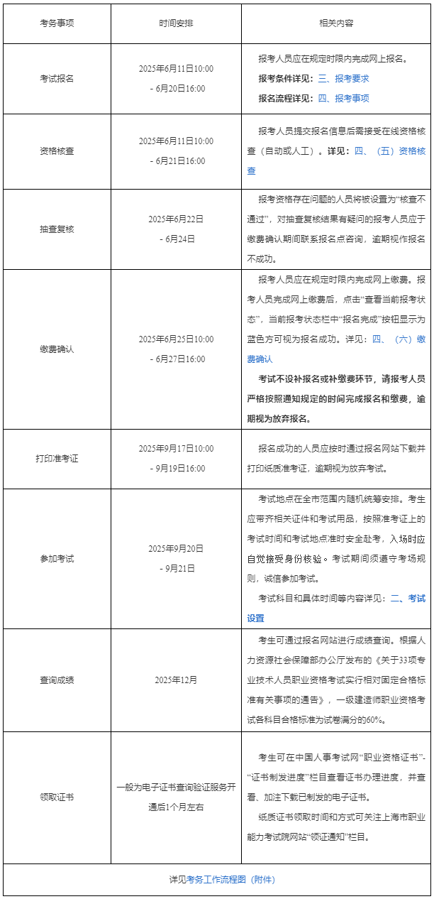 根據(jù)《人力資源社會(huì)保障部辦公廳關(guān)于2025年度專業(yè)技術(shù)人員職業(yè)資格考試工作計(jì)劃及有關(guān)事項(xiàng)的通知》(人社廳發(fā)〔2025〕1號(hào))安排,結(jié)合本市實(shí)際,現(xiàn)將上海市2025年度全國(guó)一級(jí)建造師職業(yè)資格考試有關(guān)事宜通知如下: