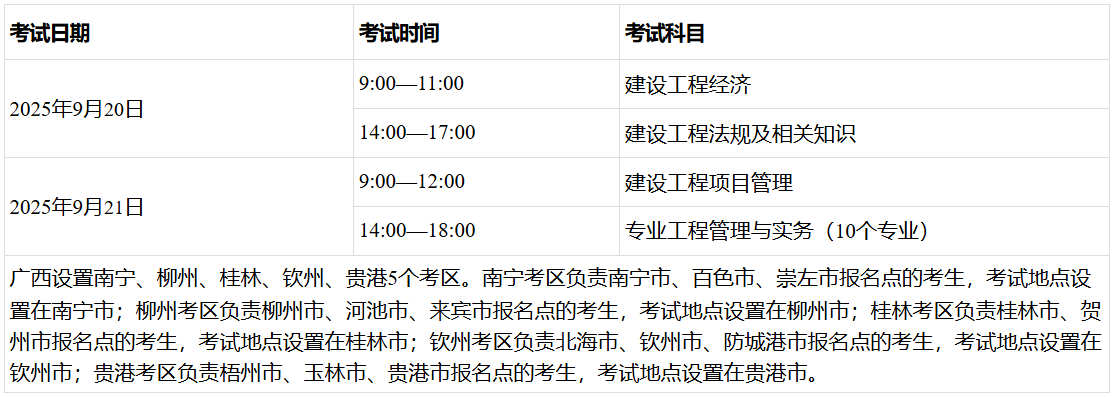 根據(jù)《人力資源和社會(huì)保障部人事考試中心關(guān)于2025年度一級(jí)建造師職業(yè)資格考試考務(wù)工作的通知》(人考中心函〔2025〕20號(hào))精神,為做好2025年度一級(jí)建造師職業(yè)資格考試廣西考區(qū)考務(wù)工作,現(xiàn)將有關(guān)事項(xiàng)通知如下: