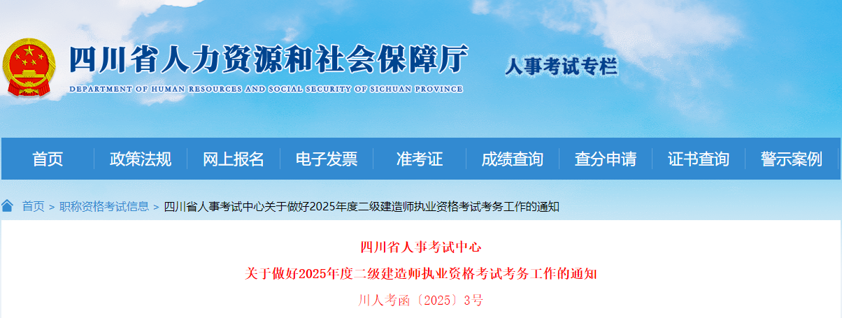根據(jù)四川省人力資源和社會保障廳《關(guān)于做好我省專業(yè)技術(shù)人員資格考試告知制有關(guān)工作的通知》(川人社辦發(fā)〔2020〕14號)以及四川省人力資源和社會保障廳、四川省住房和城鄉(xiāng)建設(shè)廳《關(guān)于做好我省二級建造師執(zhí)業(yè)資格考試工作的通知》(川人社辦發(fā)〔2014〕4號)等文件精神,為切實做好我省2025年度二級建造師執(zhí)業(yè)資格考試考務(wù)工作,現(xiàn)將有關(guān)事項通知如下: