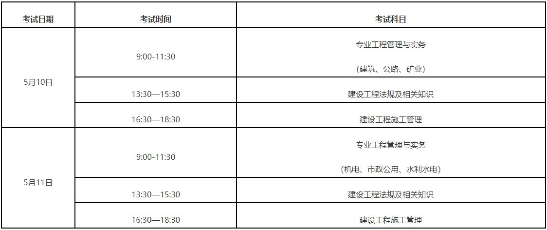 2.報(bào)考建筑工程、公路工程、礦業(yè)工程專業(yè)的考生只能在5月10日參加考試;報(bào)考市政公用工程、機(jī)電工程、水利工程專業(yè)的考生只能在5月11日參加考試。