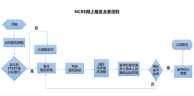 北京考生訪問全國計算機(jī)等級考試報名網(wǎng)站(教育網(wǎng):https://ncre-bm.neea.edu.cn;公網(wǎng):https://ncre-bm.neea.cn),選擇“北京市”入口登錄,按照相關(guān)提示完成賬號注冊、信息填寫、照片上傳、信息確認(rèn)、繳費(fèi)等網(wǎng)報步驟。首次登錄系統(tǒng)需要注冊獲取登錄通行證,若考生已有通行證賬號,可以直接登錄報名。