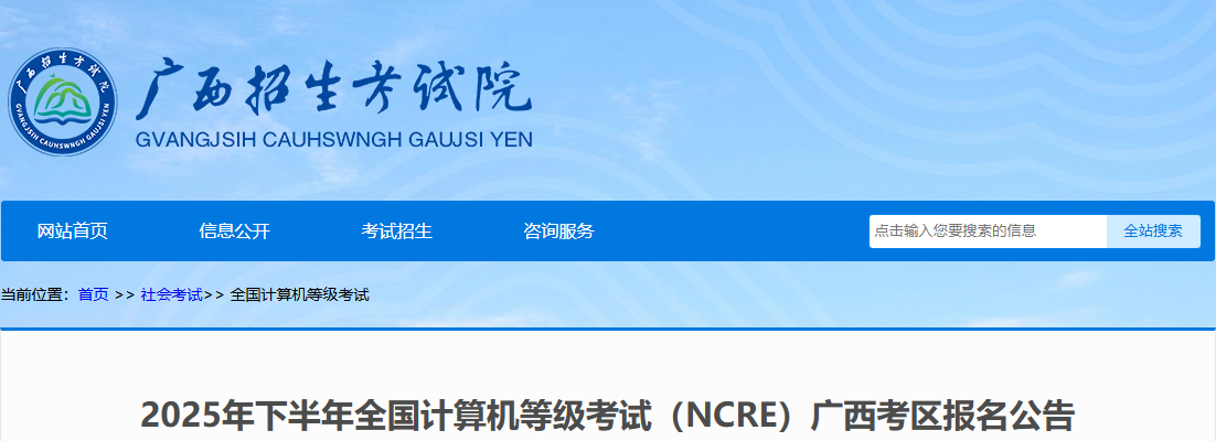 2025年下半年(第76次)全國計算機(jī)等級考試(NCRE)將于2025年9月20日至22日舉行,現(xiàn)將廣西考區(qū)報名有關(guān)事項公告如下:
