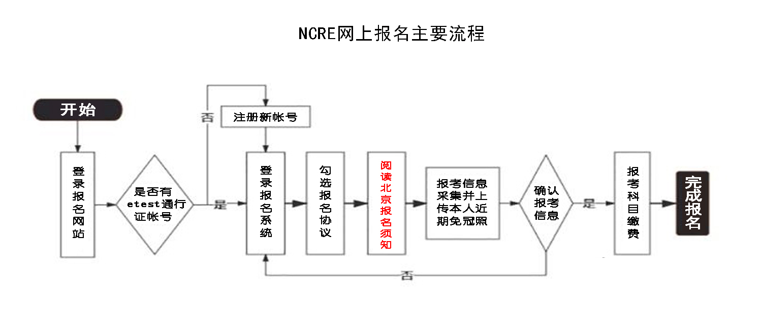 北京考生登錄全國計(jì)算機(jī)等級(jí)考試報(bào)名網(wǎng)站(網(wǎng)址:https://ncre-bm.neea.cn),點(diǎn)擊“(11)北京市”報(bào)名入口進(jìn)行網(wǎng)上報(bào)名。考生若已有賬號(hào),可直接登錄報(bào)名;若沒有賬號(hào),需通過“ETEST通行證”網(wǎng)站進(jìn)行注冊(cè)。考生登錄報(bào)名網(wǎng)站后,須首先閱讀“省通告:北京市NCRE報(bào)名須知”等公告,知悉并遵照相關(guān)要求,按照網(wǎng)頁提示完成信息填寫、照片上傳和繳費(fèi)。