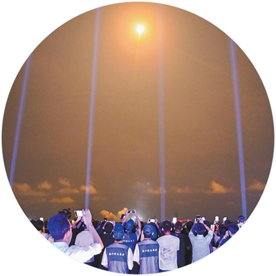 “5,4,3,2,1”——火箭的火焰照亮夜幕,平臺的光束射向天際……19時50分,火箭發(fā)射升空,游客們舉著手機記錄,現(xiàn)場歡呼聲陣陣。“很興奮、很震撼,感覺一伸手就能‘抓’到火箭。”延鈺菲說。