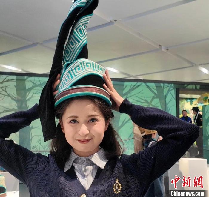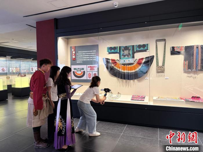 5月15日,迪拉熱·阿地力江與同學(xué)在西南民族大學(xué)民族博物館拍攝民族服飾?!≈行戮W(wǎng)記者 賀劭清 攝