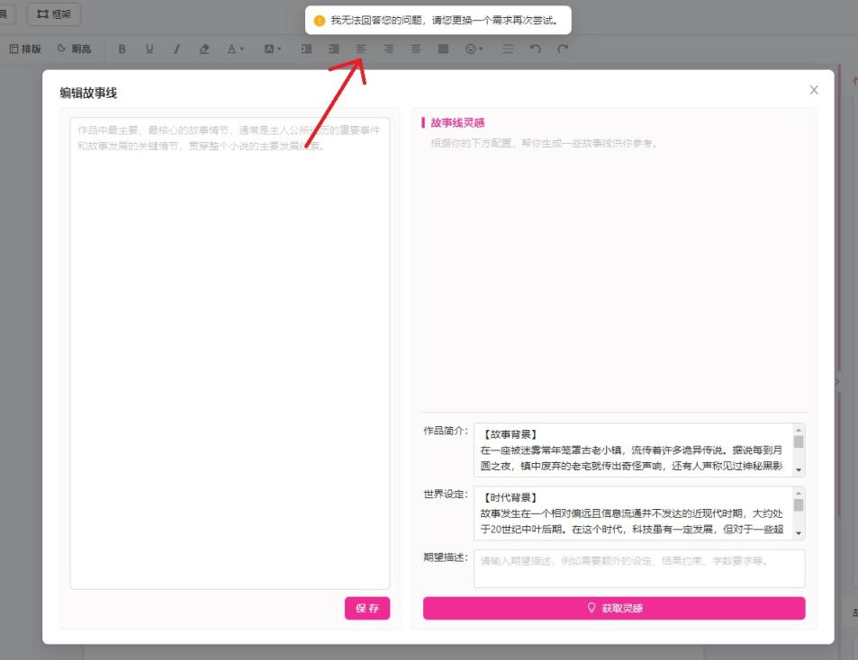 寫一部小說,總得先有個設(shè)定。通過系統(tǒng)的AI功能,記者倒是成功生成出了作品簡介和世界設(shè)定。但之后,記者想繼續(xù)通過AI寫出劇情故事線時,系統(tǒng)卻總會提示:“我無法回答您的問題,請您更換一個需求再次嘗試。”記者一連換了好幾個作品背景,最后都卡死在了設(shè)計故事線這一關(guān)。
