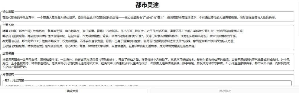 根據(jù)記者選擇的“都市+玄幻”題材,AI設(shè)計出了一篇名叫“都市靈途”的小說,大綱里不但有主要人物,連故事梗概、分卷結(jié)構(gòu)和故事線也都齊全,看起來還挺像那么回事。隨后記者請AI開始寫第一卷第一章的內(nèi)容,又經(jīng)歷了幾次失敗之后,AI成功生成出了6000字的開篇章節(jié)。