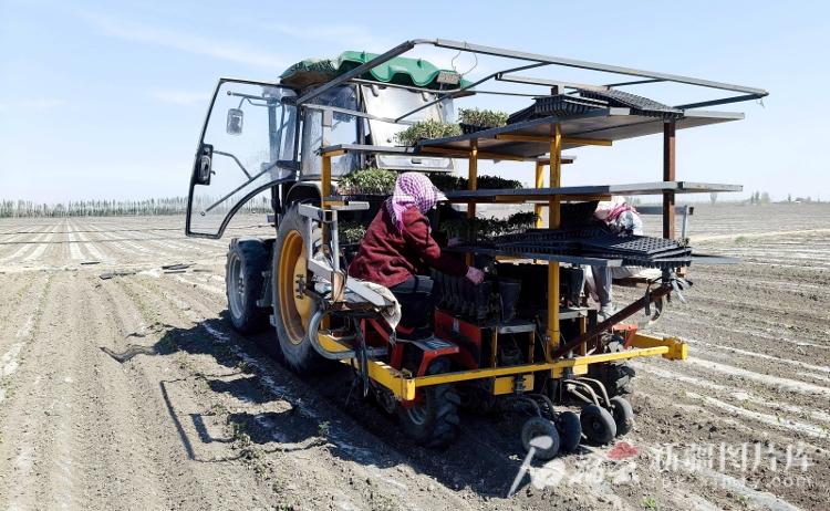 4月29日,沙灣市烏蘭烏蘇鎮(zhèn)頭浮新村500余畝訂單番茄地里,番茄秧苗移栽機(jī)正在作業(yè)。烏蘇市融媒體中心供圖