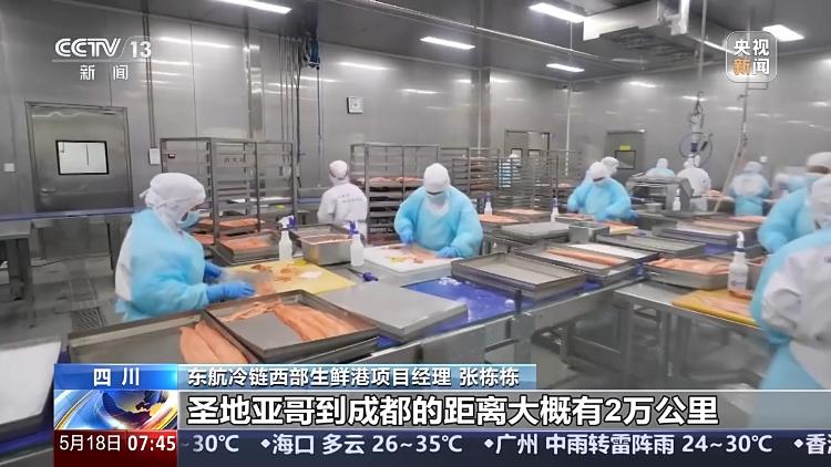 東航冷鏈西部生鮮港項目經(jīng)理 張棟棟:冰鮮三文魚的加工,其實是一場與時間的賽跑,圣地亞哥到成都的距離大概有2萬公里,航線開通后,口岸加工、航線物流,還有終端配送,我們可以做到(最快)48個小時就能讓成都當(dāng)?shù)氐木用?,吃到地球另一端過來的三文魚。
