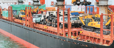 近日,在山東港口煙臺港蓬萊港區(qū),出口圭亞那和蘇里南的國產(chǎn)卡車被裝入拉美航線貨輪。