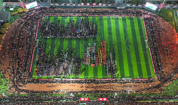 2025年貴州“村超”開幕式現(xiàn)場(2025年1月4日攝,無人機照片)。新華社記者 楊文斌 攝