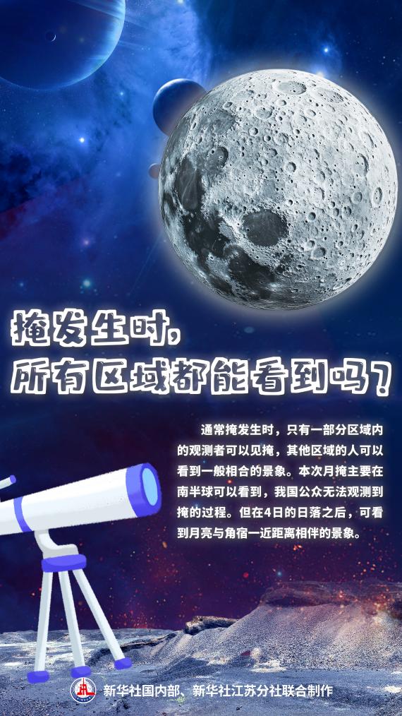 中國科學院紫金山天文臺科普主管王科超說,掩是天體之間相對運動所產生的一種視覺現象,指的是一個天體被另一個視直徑較大的天體所掩蔽。掩需要發(fā)生在兩個天體地心視赤經或地心視黃經相同的時候,即天文學上的合。換言之,發(fā)生掩時,兩個天體必然是相合的,但能否實際觀察到掩,還取決于天體視直徑大小、觀測者位置等。通常,只有一部分區(qū)域內的觀測者可以見掩,其他區(qū)域的人可以看到一般相合的景象。