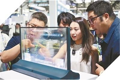 觀眾在第三屆中國(guó)(安徽)科技創(chuàng)新成果轉(zhuǎn)化交易會(huì)上體驗(yàn)一款多語(yǔ)種AI透明屏。