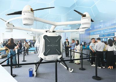 近日,觀眾在第三屆中國(guó)(安徽)科技創(chuàng)新成果轉(zhuǎn)化交易會(huì)上參觀一款飛行器。