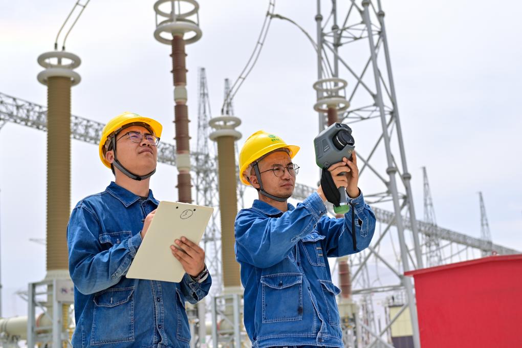 在新疆環(huán)塔里木盆地750千伏輸變電工程若羌750千伏變電站,運(yùn)檢人員檢測(cè)設(shè)備溫度(6月27日攝)。新華社記者 丁磊 攝
