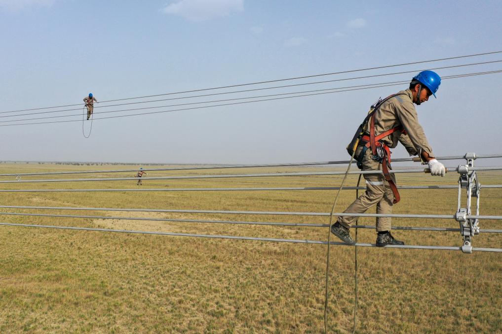 7月13日,在塔克拉瑪干沙漠南緣,最后一段電線被轟鳴著的牽引機(jī)拽著,從183號(hào)鐵塔出發(fā),掠過(guò)和若鐵路和國(guó)道315線,最終牢牢錨定在188號(hào)鐵塔上。