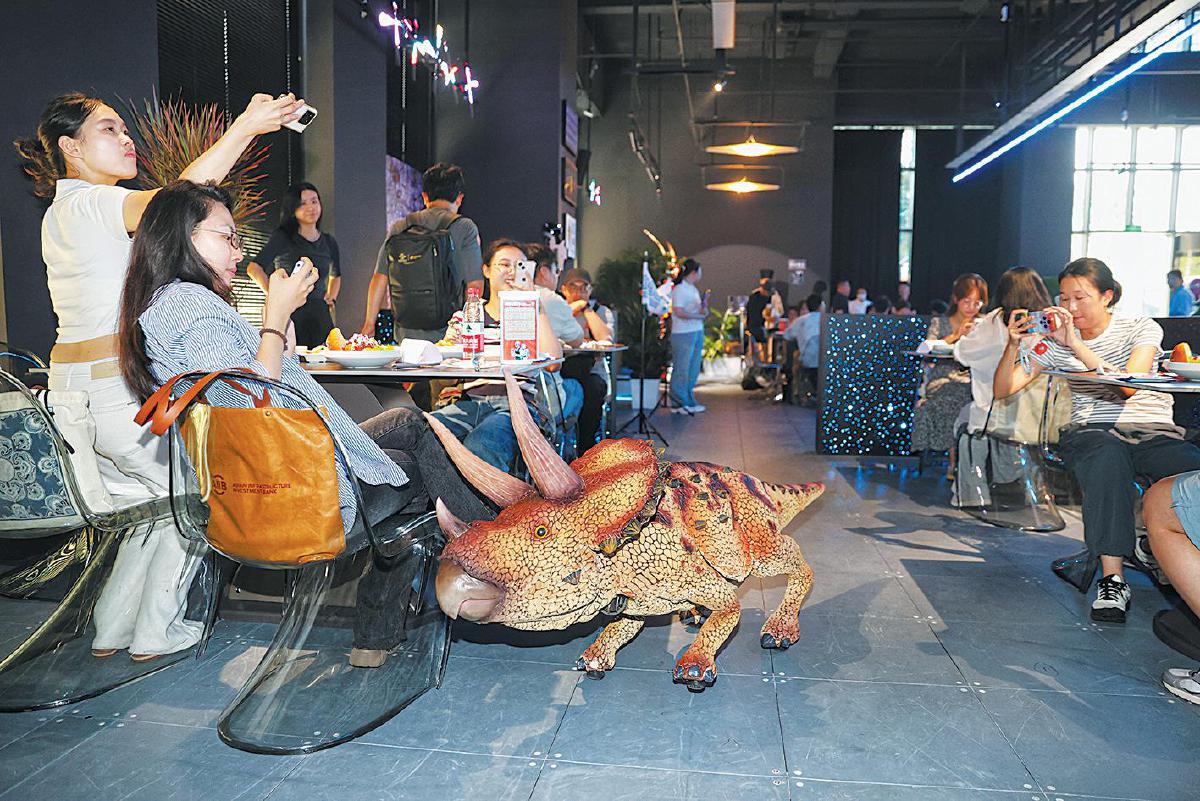 在機(jī)器人主題餐廳“機(jī)器人焰究所”等餐期間,市民可以和恐龍機(jī)器人、雕刻機(jī)器人等互動(dòng)。