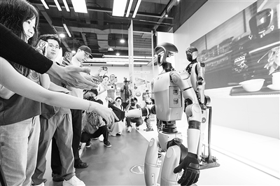 在位于北京經(jīng)開區(qū)機(jī)器人大世界的全球首個(gè)具身智能機(jī)器人4S店內(nèi),觀眾與一款人形機(jī)器人握手。新華社記者 鞠煥宗 攝