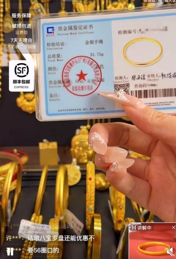 有人在猶豫是否下單,有人則對(duì)首飾的材質(zhì)提出了疑問。“你們這首飾有鋼印嗎?”看到彈幕里飄過這樣一句話,主播將手中的手鐲對(duì)著鏡頭,只見手鐲上刻著“999”三個(gè)數(shù)字。“我們的手鐲都是999足金的?。∧判南聠?,放心戴……”