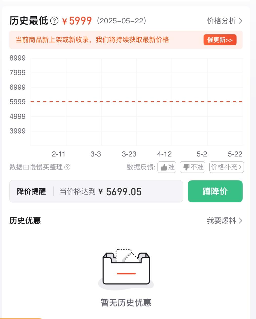 而唯一的這款比價(jià)APP,識(shí)別出結(jié)果之后,顯示的也都是商品的原價(jià)??闪硪欢说闹辈ラg里,一會(huì)兒又是平臺(tái)券,一會(huì)兒又是國(guó)家補(bǔ)貼券,減來減去之后,早就不是原先的價(jià)格了。記者分兩天在同一家售賣學(xué)習(xí)機(jī)的直播間看到,前一天因?yàn)橛懈鞣N補(bǔ)貼的存在,原價(jià)5999的學(xué)習(xí)機(jī)降價(jià)到了4999元,而第二天因?yàn)槿鄙倭艘粡埰脚_(tái)券,產(chǎn)品價(jià)格回升到了5499元。但在比價(jià)平臺(tái),這兩天包括之前幾個(gè)月的產(chǎn)品價(jià)格曲線沒有絲毫波動(dòng),一直都維持在5999的原價(jià)上。下方的“歷史優(yōu)惠”一欄,也沒有任何顯示。