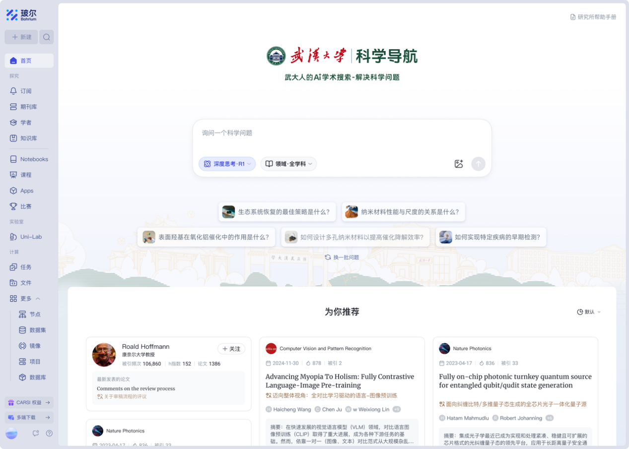 武漢大學(xué)表示,“科學(xué)導(dǎo)航”平臺是武漢大學(xué)與北京科學(xué)智能研究院和深勢科技深度合作、加快推進(jìn)“數(shù)智武大”建設(shè)的又一項重要舉措和示范案例。該平臺系統(tǒng)性解決了師生在文獻(xiàn)篩選、跨學(xué)科知識發(fā)現(xiàn)及學(xué)術(shù)資源獲取等環(huán)節(jié)中的關(guān)鍵痛點問題,尤其有效應(yīng)對了信息過載、檢索繁雜、整理耗時等挑戰(zhàn),助力師生高效探索學(xué)術(shù)前沿最新動態(tài),將更多精力投入真正的科研突破。
